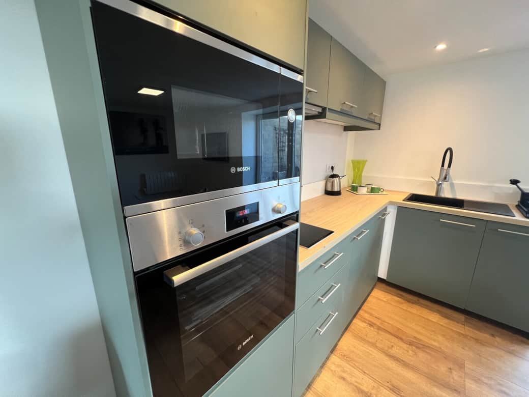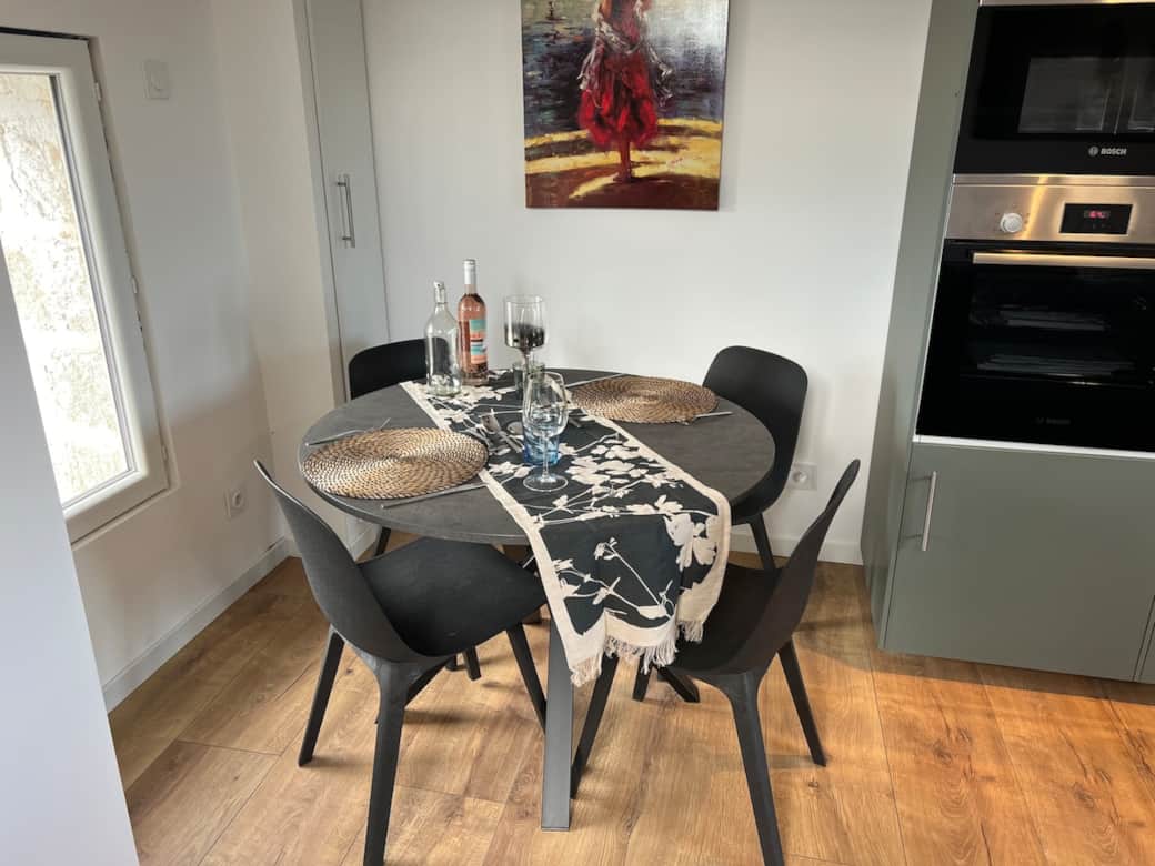 Kitchen, Baby high chair, Coffee machine, Kitchen stove, Microwave, Oven, Refrigerator, Toaster, Barbecue utensils, Cooking basics, Dining table, Dishes and silverware, Hot water kettle, Wine glasses